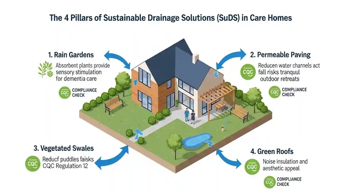 The future of sustainable drainage solutions CQC care home design is the integration of SuDS (Sustainable Drainage Systems). In Morden, Policy EN18 of the Local Plan encourages SuDS to manage surface water runoff, which often plagues the surrounding area.